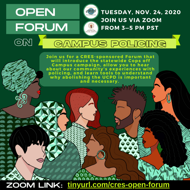 Join us for a CRES-sponsored Forum that will introduce the statewide Cops off Campus campaign, allow you to hear about our community’s experiences with policing, and learn tools to understand why abolishing the UCPD is important and necessary.
