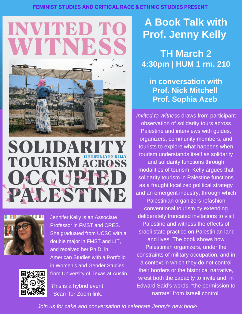 Invited to Witness draws from participant observation of solidarity tours across Palestine and interviews with guides, organizers, community members, and tourists to explore what happens when tourism understands itself as solidarity and solidarity functions through modalities of tourism. Kelly argues that solidarity tourism in Palestine functions as a fraught localized political strategy and an emergent industry, through which Palestinian organizers refashion conventional tourism by extending deliberately truncated invitations to visit Palestine and witness the effects of Israeli state practice on Palestinian land and lives. The book shows how Palestinian organizers, under the constraints of military occupation, and in a context in which they do not control their borders or the historical narrative, wrest both the capacity to invite and, in Edward Saids words, “the permission to narrate” from Israeli control.