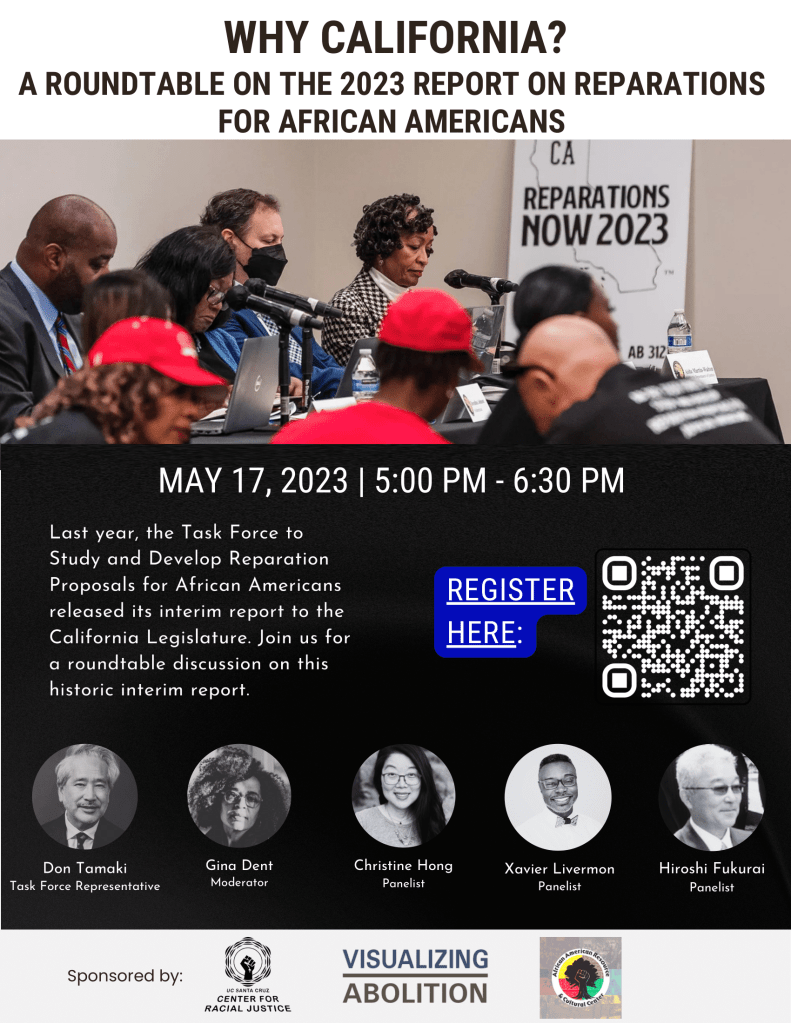In this last stretch, please join us for a roundtable discussion with task force member Don Tamaki, moderated by Gina Dent and featuring panelists Christine Hong, Xavier Livermon, and Hiroshi Fukurai. Panelists will discuss the significance of California, multiracial solidarity, and broad-based public education in the struggle for Black reparations.