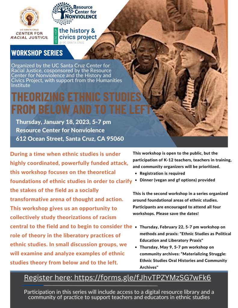 During a time when ethnic studies is under highly coordinated, powerfully funded attack, this workshop focuses on the theoretical foundations of ethnic studies in order to clarify the stakes of the field as a socially transformative arena of thought and action. This workshop gives us an opportunity to collectively study theorizations of racism central to the field and to begin to consider the role of theory in the liberatory practices of ethnic studies. In small discussion groups, we will examine and analyze examples of ethnic studies theory from below and to the left.
