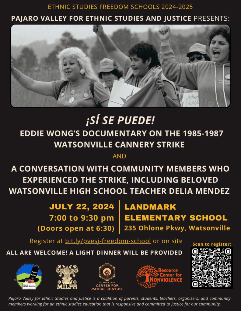 Starting this July and going into next fall, which marks the fortieth anniversary of the start of the 1985-87 Watsonville cannery strike, our monthly Ethnic Studies Freedom School will focus on community empowerment through collective study of the Watsonville cannery strike and its grassroots transformation of Watsonville. From a foundation of community knowledge, we will learn from each other and collectively study and organize to enact people power, economic justice, food sovereignty, abolition and community safety, and healing.