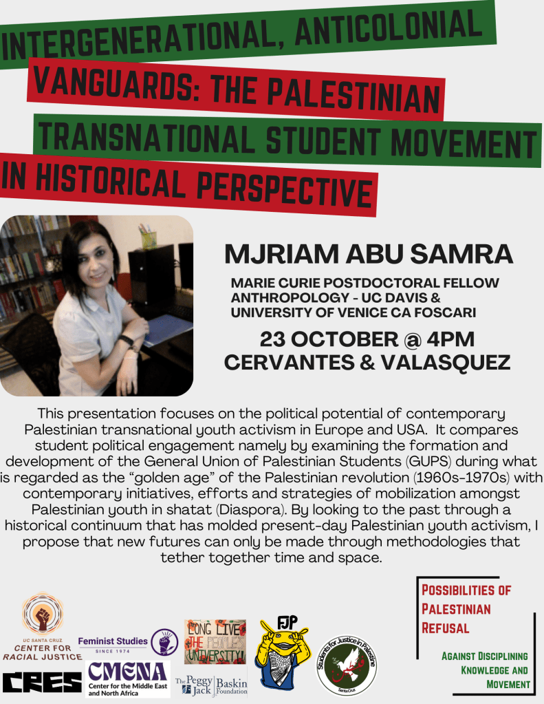 UCSC Center for Racial Justice | Department of Critical Race and Ethnic Studies | Department of Feminist Studies | Department of Anthropology | Department of Politics | Department of Sociology | The Peggy and Jack Baskin Foundation | CMENA | CSAS | The Center for Cultural Studies | FJP | SJP