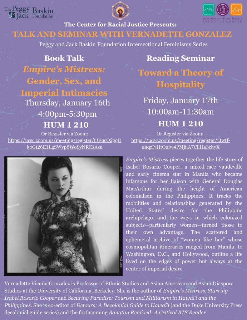 Vernadette Vicuña Gonzalez is Professor of Ethnic Studies and Asian American and Asian Diaspora Studies at the University of California, Berkeley. She is the author of Empire’s Mistress, Starring Isabel Rosario Cooper and Securing Paradise: Tourism and Militarism in Hawai‘i and the Philippines. She is co-editor of Detours: A Decolonial Guide to Hawai’i (and the Duke University Press decolonial guide series) and the forthcoming Bangtan Remixed: A Critical BTS Reader.