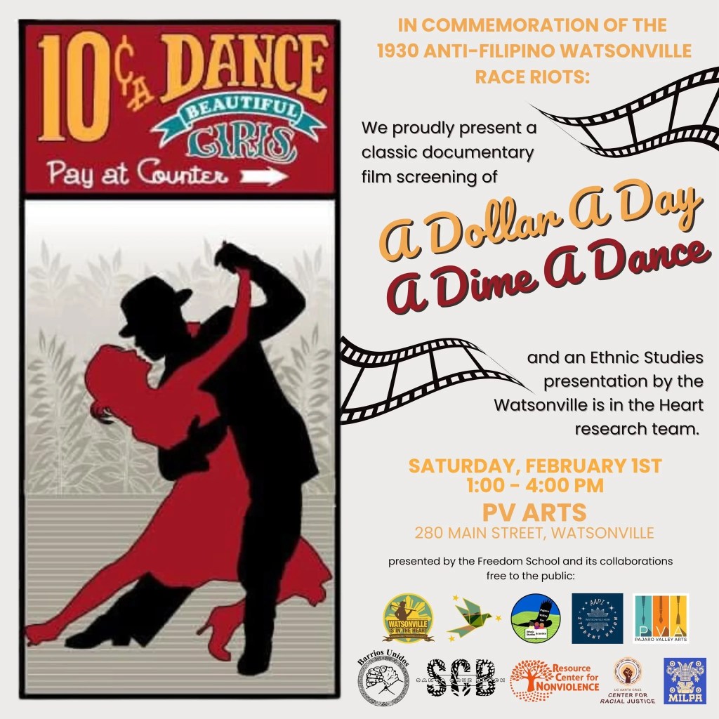 In commemoration of the 1930 anti-Filipino race riots, the Tobera Project and Pajaro Valley for Ethnic Studies and Justice (PVESJ) welcomes you to our February Watsonville Ethnic Studies Freedom School, which will feature the documentary A Dollar a Day, A Dime a Dance (1984), followed by an ethnic studies presentation by the Watsonville Is in the Heart research team.