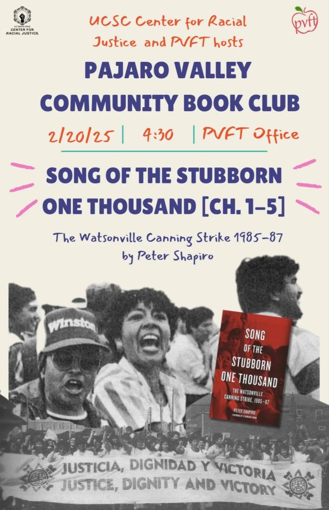 The Center for Racial Justice and Pajaro Valley Federation of Teachers invites you to our new reading group, the Pajaro Valley Community Book Club (PVCBC)! PVCBS is a book club that focuses on labor history, worker solidarity, social justice movements, and class struggles as they relate to the Pajaro Valley. Please join us for discussions on shared readings, food, and some good old-fashioned community building!