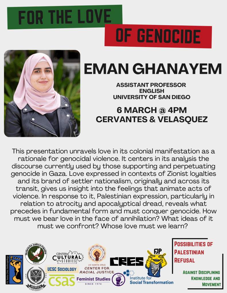 This presentation unravels love in its colonial manifestation as a rationale for genocidal violence. It centers in its analysis the discourse currently used by those supporting and perpetuating genocide in Gaza. Love expressed in contexts of Zionist loyalties and its brand of settler nationalism, originally and across its transit, gives us insight into the feelings that animate acts of violence. In response to it, Palestinian expression, particularly in relation to atrocity and apocalyptical dread, reveals what precedes in fundamental form and must conquer genocide. How must we bear love in the face of annihilation? What ideas of it must we confront? Whose love must we learn?