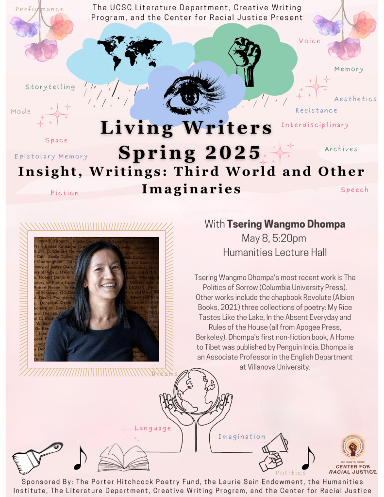 Tsering Wangmo Dhompa’s most recent work is The Politics of Sorrow (Columbia University Press). Other works include the chapbook Revolute (Albion Books, 2021) three collections of poetry: My Rice Tastes Like the Lake, In the Absent Everyday and Rules of the House (all from Apogee Press, Berkeley). Dhompa’s first non-fiction book, A Home to Tibet was published by Penguin India. Dhompa is an Associate Professor in the English Department at Villanova University.