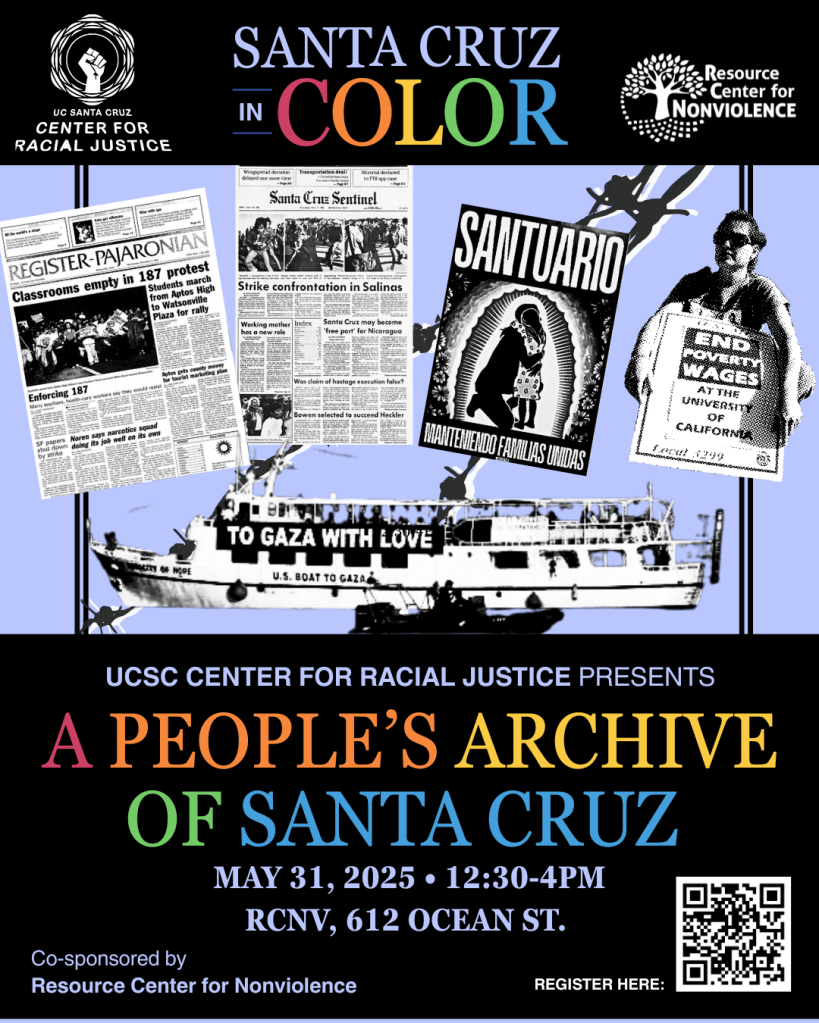 Come learn about local movements for sanctuary, Palestine, workers, and antiracism! Please join us for the kick-off of Santa Cruz in Color, our open-access archive of local people’s struggles for justice.This launch of “A People’s Archive of Santa Cruz” will feature presentations, workshops, and a community conversation.