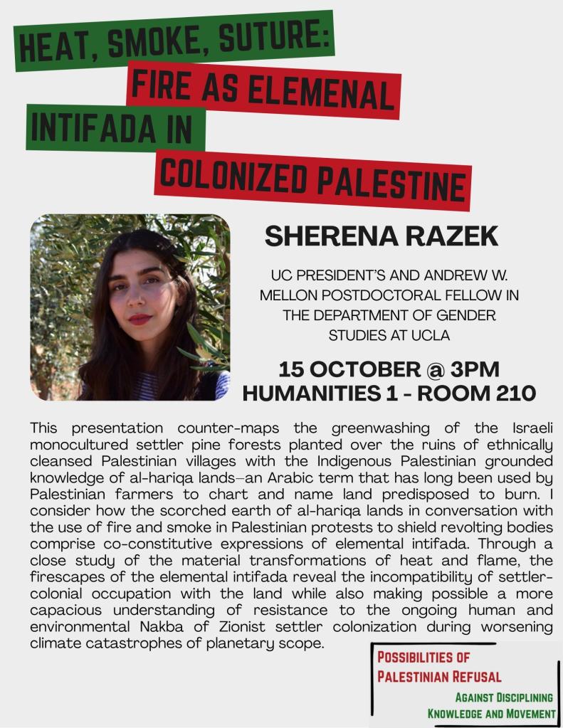 This presentation counter-maps the greenwashing of the Israeli monocultured settler pine forests planted over the ruins of ethnically cleansed Palestinian villages with the Indigenous Palestinian grounded knowledge of al-hariqa lands–an Arabic term that has long been used by Palestinian farmers to chart and name land predisposed to burn. Dr. Razek considers how the scorched earth of al-hariqa lands in conversation with the use of fire and smoke in Palestinian protests to shield revolting bodies comprise co-constitutive expressions of elemental intifada. Through a close study of the material transformations of heat and flame, the firescapes of the elemental intifada reveal the incompatibility of settler-colonial occupation with the land while also making possible a more capacious understanding of resistance to the ongoing human and environmental Nakba of Zionist settler colonization during worsening climate catastrophes of planetary scope.
