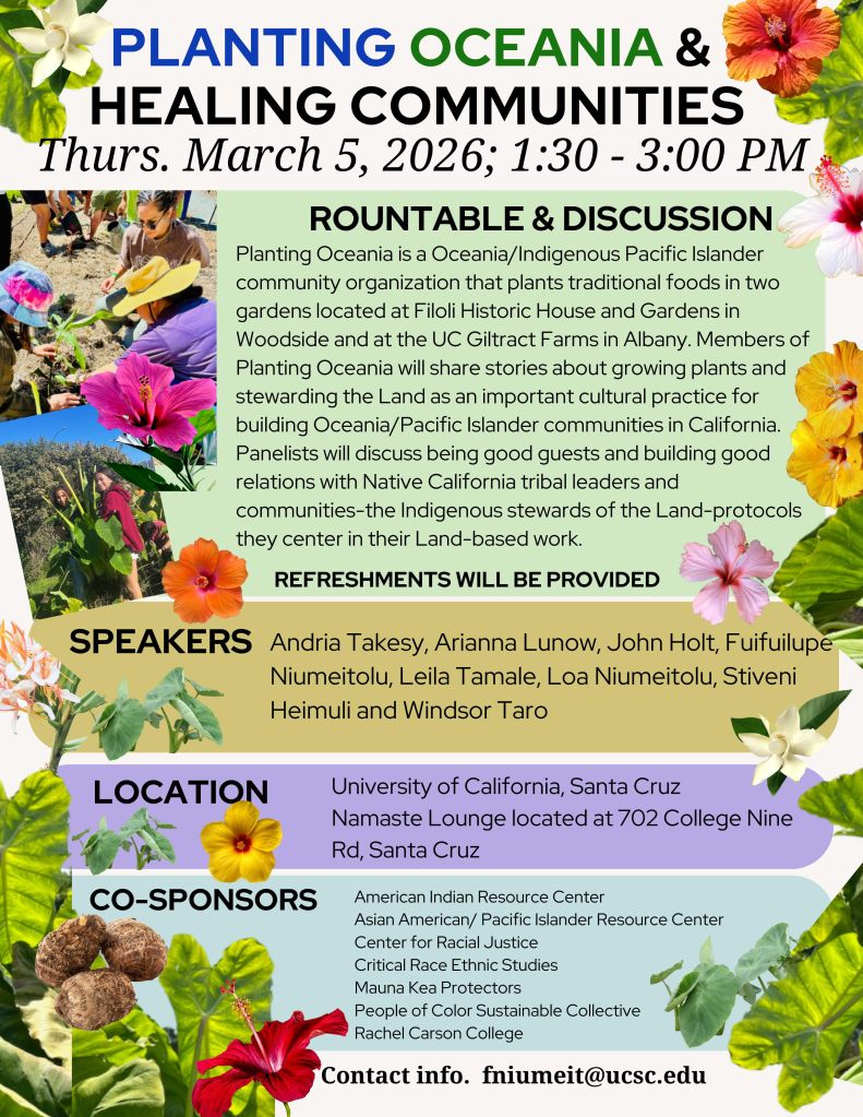 Planting Oceania is a Oceanian/Indigenous Pacific Islander community organization that plants traditional foods in two gardens located at Filoli Historic House and Gardens in Woodside and at the UC Giltract Farms in Albany. Members of Planting Oceania will share stories about growing plants and stewarding the Land as an important cultural practice for building Oceania/Pacific Islander communities in California. Panelists will discuss being good guests and building good relations with Native California tribal leaders and communities–the Indigenous stewards of the Land–protocols they center in their land-based work.